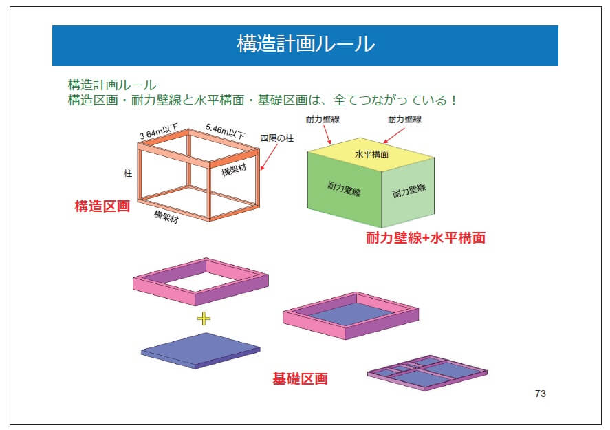 大事なポントの一つとして構造計画のルールである、構造区画・耐力線と水平構面・規則角は全てつながっていることが大事ですよ。