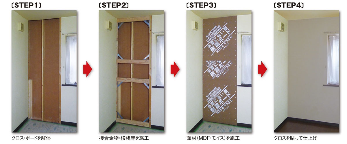 耐震ボードを貼ったり、筋交いを入れるなどして壁を補強すれば、大きな揺れにも耐えられます。