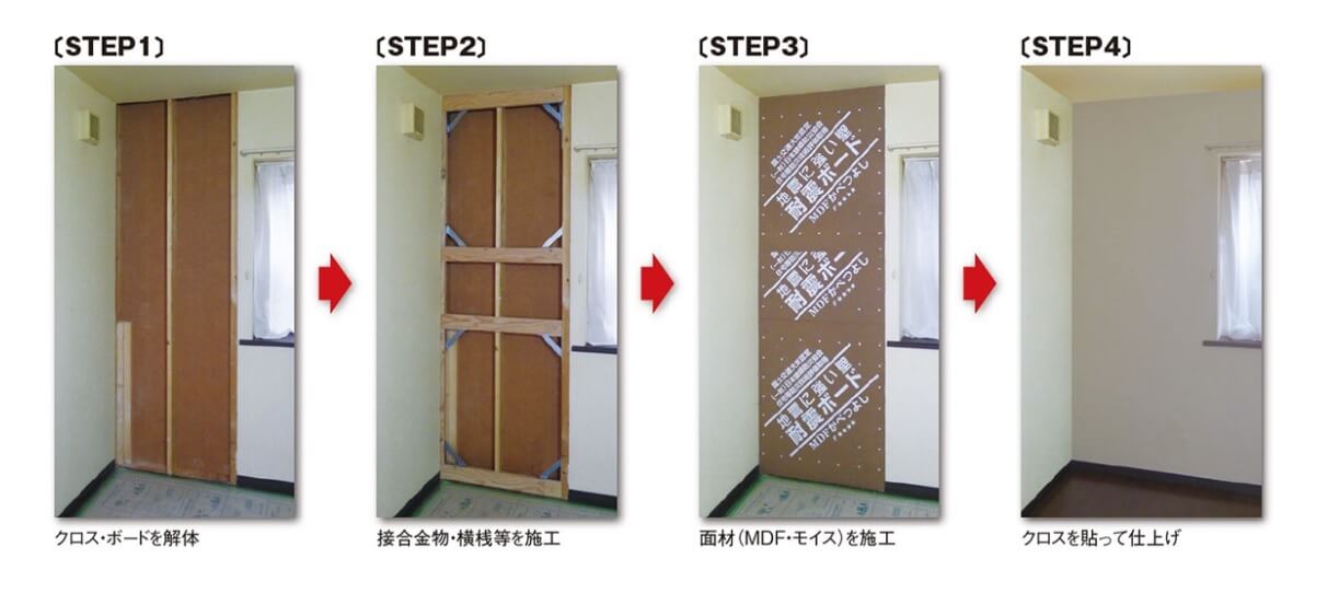 室内の壁を補強するには壁を剥して補強金物を設置し、耐震パネルを貼るという方法があります。