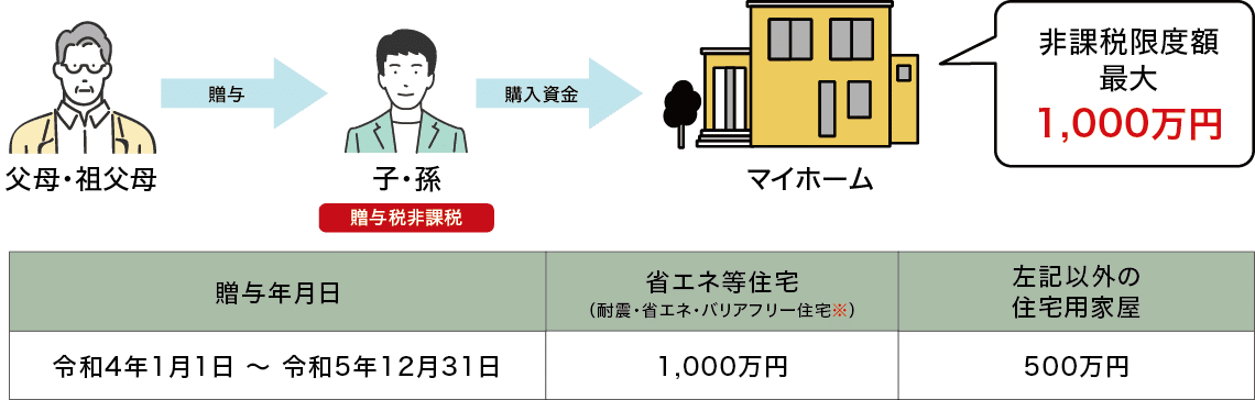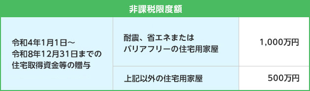 具体的には、質の高い住宅には1000万円、一般住宅には500万円が贈与金額の上限となります。