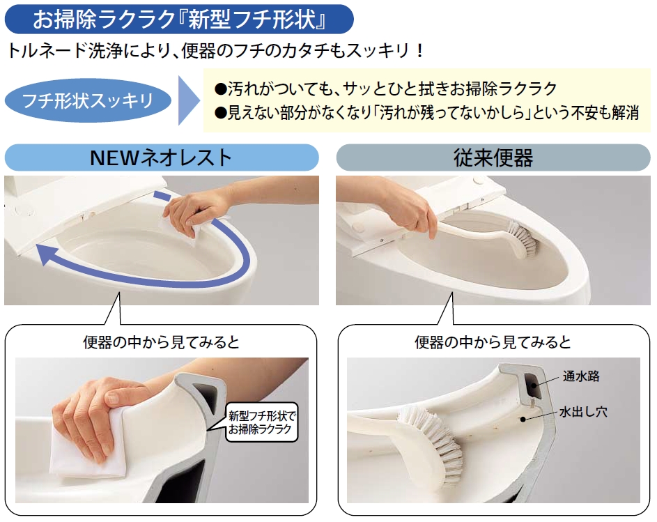 洗浄方法が変わっただけでなく、便器のフチの形状も大きく変化。フチの折り返しがなくなったものもあり、手が届きやすくなっています。
