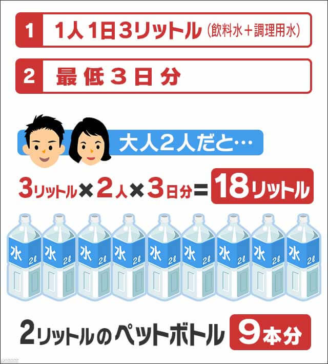 備蓄しておく水は1人1日3リットルで3日分が必要