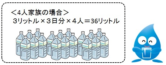 備蓄しておく水の量は、1人あたり、1日3リットルが目安です。