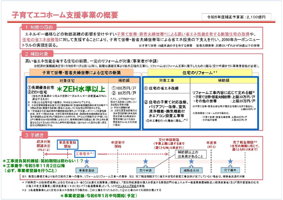 子育てエコホーム支援事業2024 新築の補助金について