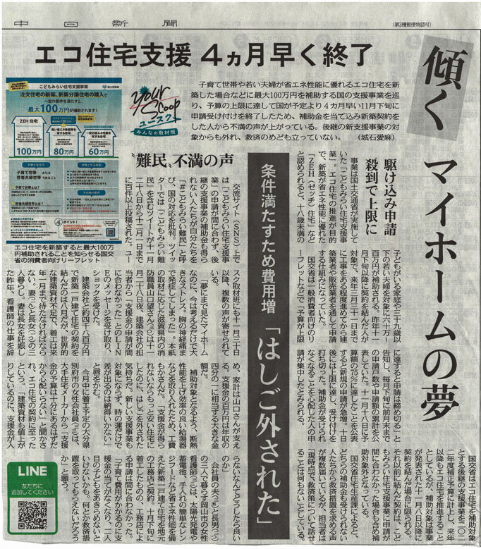 12月2日(金)の中日新聞の3面記事で、エコ住宅支援 4か月はやく終了の記事が出ていました。 エコ住宅を新築した場合などに最大100万円を補助する国の支援事業が、予算の上限に達して予定より早い11月下旬に申請受付が終了し […]