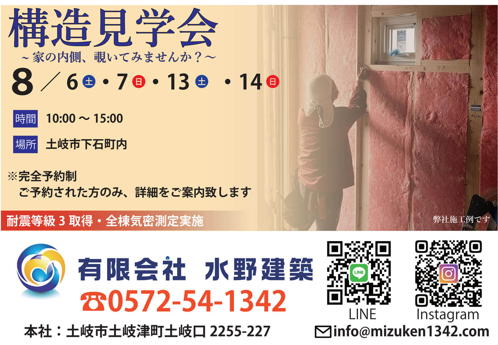 今週の8月6日(土)、7日(日) 来週の8月13日(土)、14日(日) は土岐市下石町で構造見学会を開催します 開催時間は午前10時から午後3時です この家は水野建築の標準仕様となりますが、安 […]
