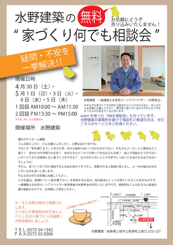 水野建築の”家づくりなんでも相談会” ~売り込みいたしません! お気軽にどうぞ~ 不安・疑問を一挙解決!! ■開催日時と時間です。 午前1組、午後1組の対応となります 4月30日(土) 午前1 […]