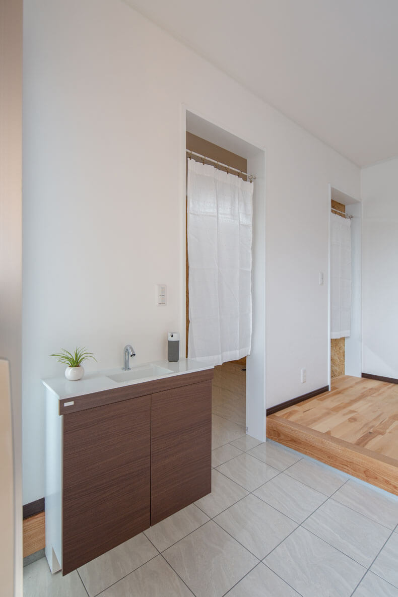 玄関につくる洗面台で帰宅後すぐに手洗い、うがい