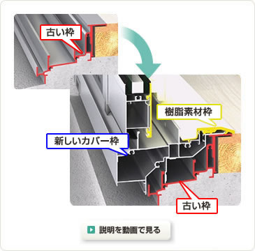 「カバー工法」とは外壁と既存のサッシ枠はそのままで、新たにサッシを取り付けて既存のアルミサッシ枠をカバーしてしまう工法です。