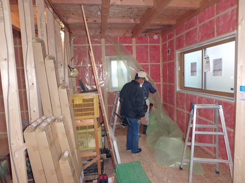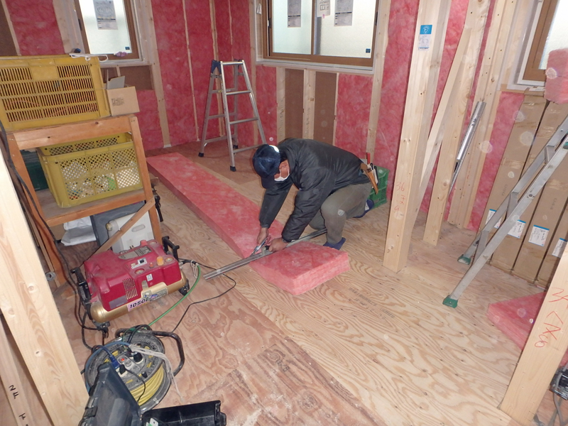 土岐市泉大沼町S様邸では内部では大工さんによる断熱工事、