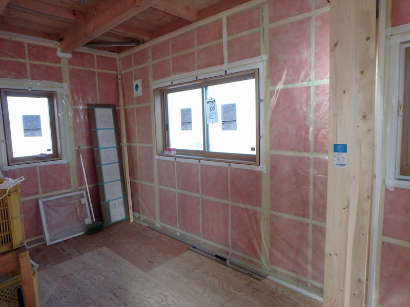 グラスウールを入れた後に、それを覆うように0.2ミリ厚の気密シートを貼ることで、