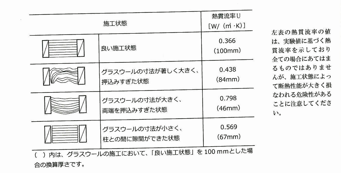 グラスウールの寸法が小さくて、柱との間に隙間ができた状態では、67ミリの断熱材の性能しか発揮しません。
