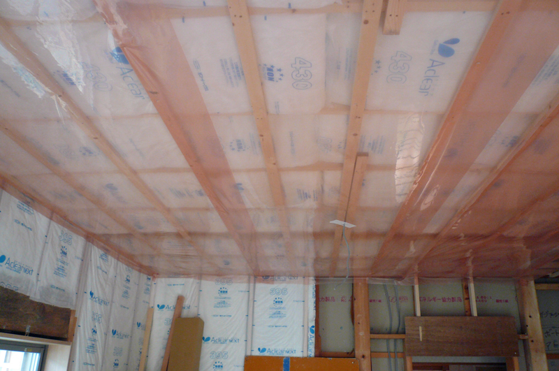 また、天井にグラスウールなどの繊維系断熱材を入れる場合は、天井下地の木材に気密シートを張る必要があります。