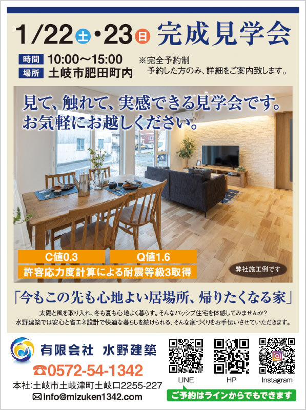 12月14日(土)・15日(日)は、性能向上リノベーション完成見学会です! 会場は多治見市滝呂町です。 ご家族3人が安心して快適に暮らせる家へのリノベーション工事が完成しました! 明るく暮らしやすいお住まい […]