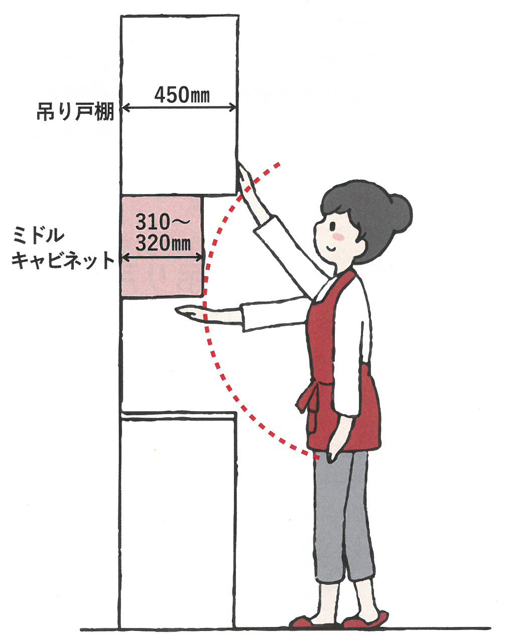 吊り戸棚の奥行き45cmより浅い31~32cm程度にするのが良いですね。