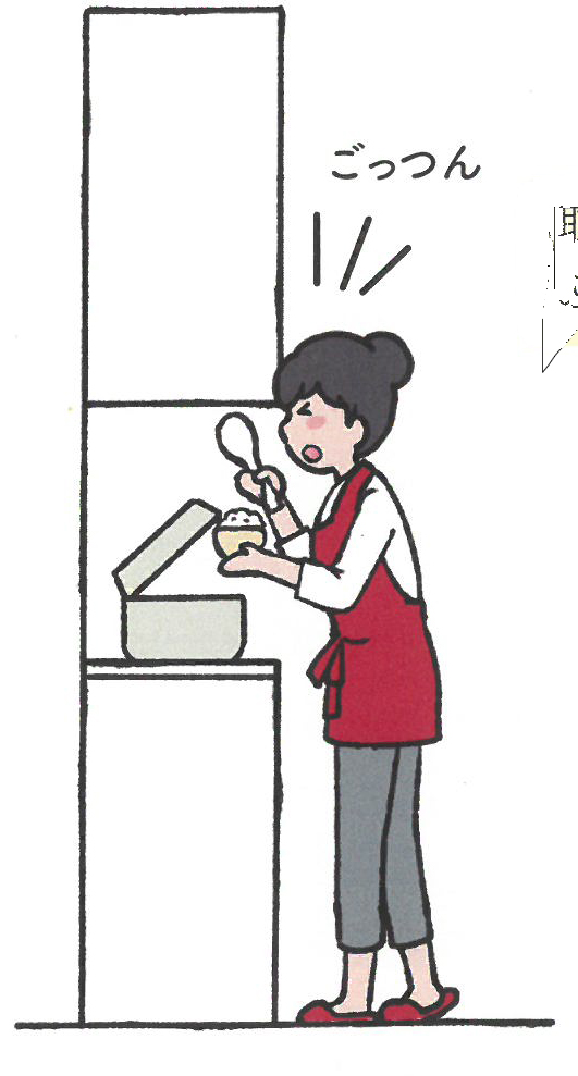 また、カウンターと吊り戸棚の奥行きが同じ場合、「吊り戸棚の設置高さ>身長」になるようにいましょう。特にカウンター上は、炊飯器などの調理家電を置くことが多いので、少し前のめりになったときに頭をぶつけることは日々のストレスになるため、気を付けましょう。