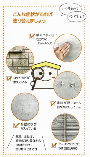 外壁は10年毎に塗替えるのが一般的とされていますが、外壁の種類や状態、住まいの環境よっては、もっと早く塗り替えが必要になることもあります。