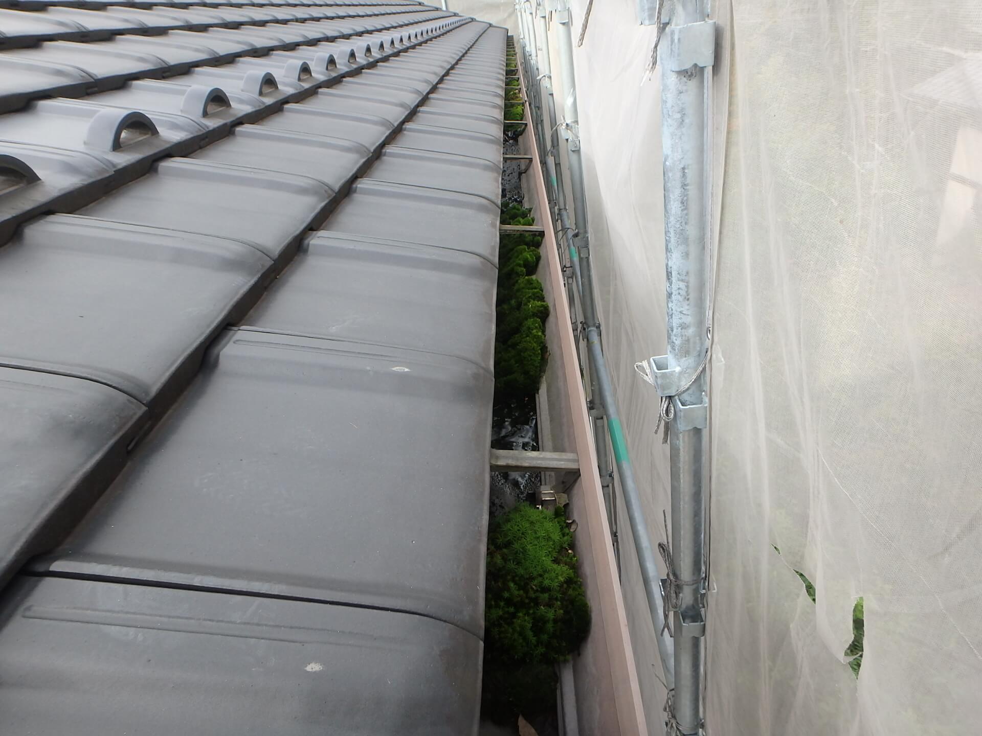 北面の軒樋は砂ぼこりが溜まってコケが生えています。このままの状態では雨が降れば樋の役割を果たせないと思います。