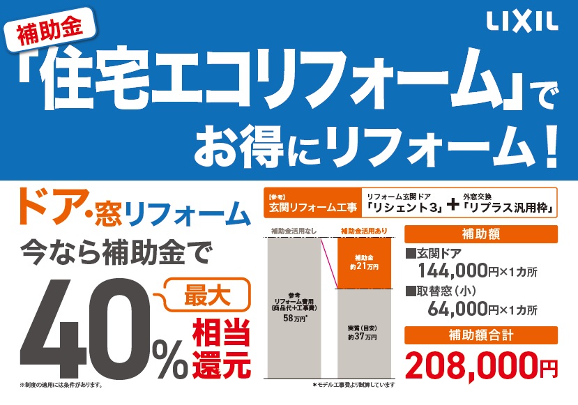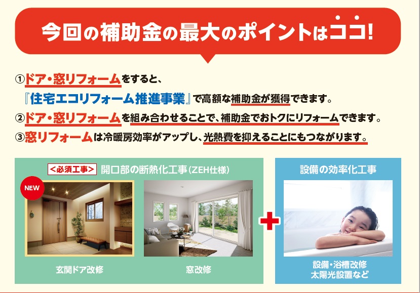 1,ドア・窓リフォームをすると、『住宅エコリフォーム推進事業』で高額な補助金が獲得できます。