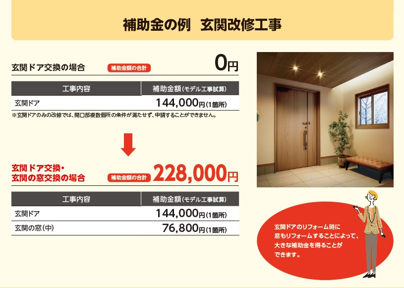 補助金事例として、玄関ドア交換工事と内窓取付工事です