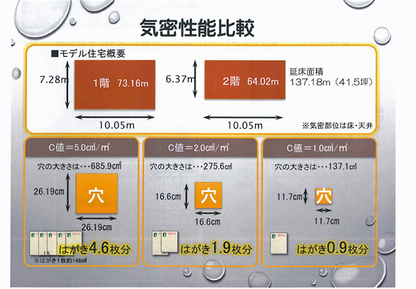 気密性能の比較表です。隙間をハガキの枚数で説明すると分かりやすいですね。