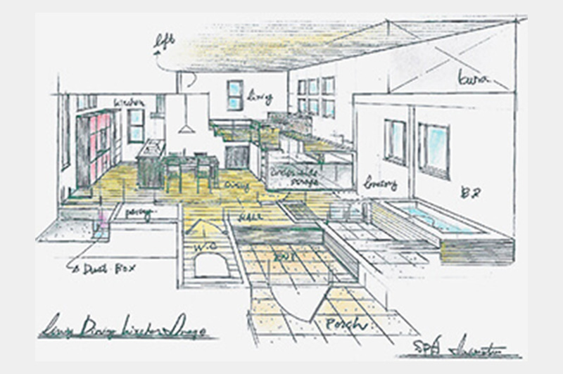 それは、部屋ごとや区画ごとにあえて高さを変え、プラスαのスペースを生んでいるからです。通常の住宅は、「縦×横」の平面での設計を行います。しかし、空間の広さには、「高さ」が関係してきます。この「高さ」を意識した設計を行うことで、家全体で活用可能なスペースを生み出すのが、ナナメウエのイエの仕組みです。