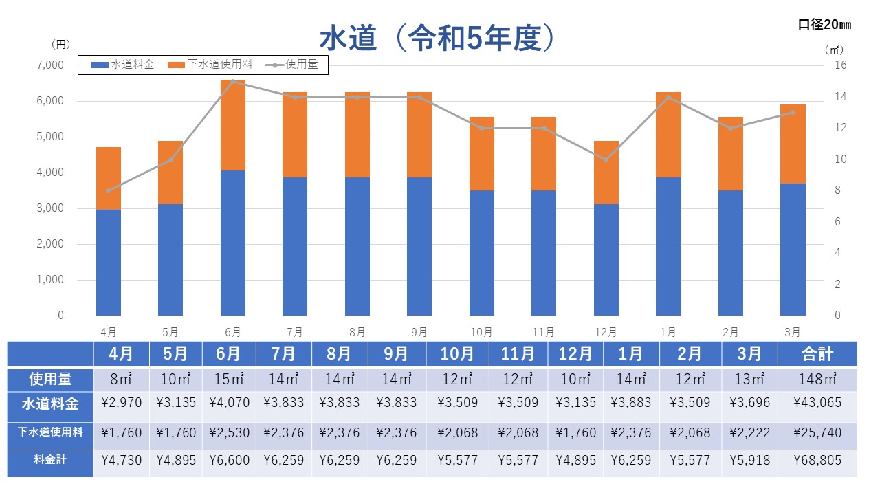 令和5年度の上水道+下水道の合計の4月から3月までの料金が¥68,805円です