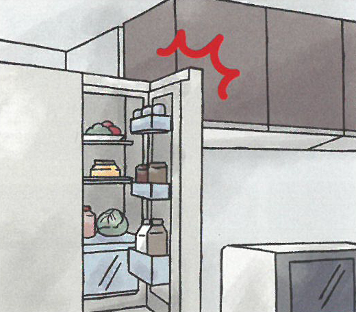 解決法は、壁を短くして、冷蔵庫のドア厚分(通常60~70㎜程度)だけ前に出すとよいですよ。