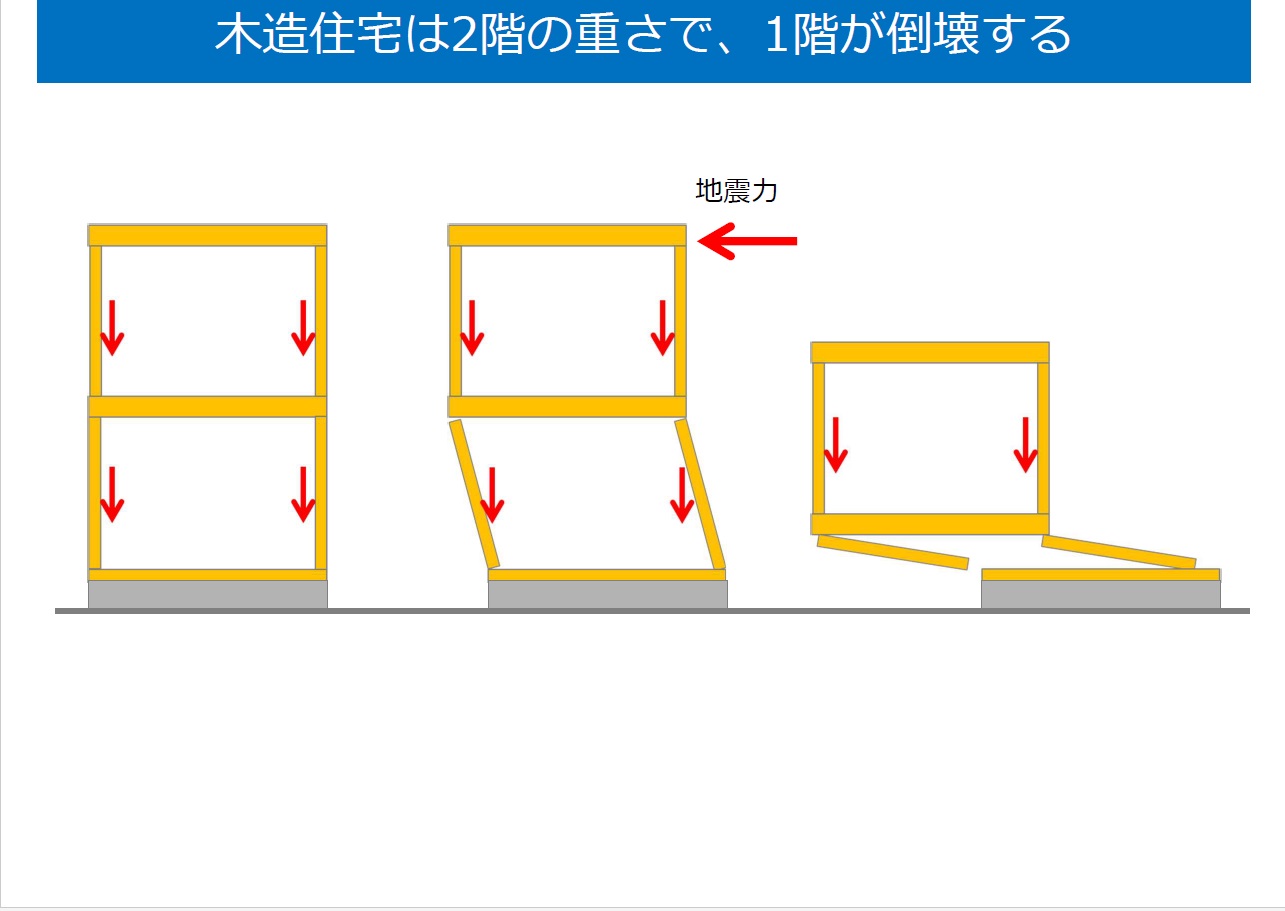 ■木造住宅の地震被害では、2階の重さで1階が押し潰されるように倒壊することが多い