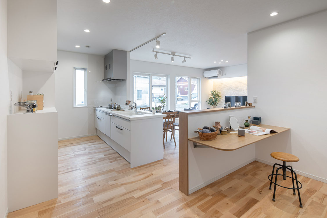リビングの一角に広めのカウンターを設置すれば、趣味を楽しむ場としてはもちろん、子どもの学習スペースとしても活躍します。