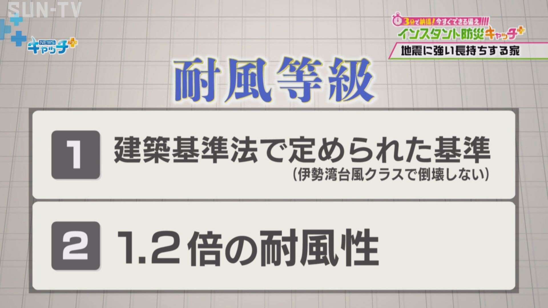耐震等級は1、2、3と3つのランクに分かれていますが、耐風等級は1、2の2つのランクになります。