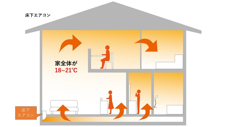 暖気の下から上にあがる性質を利用して、1階の各部屋が全体的に暖かくなるというシステムになります。