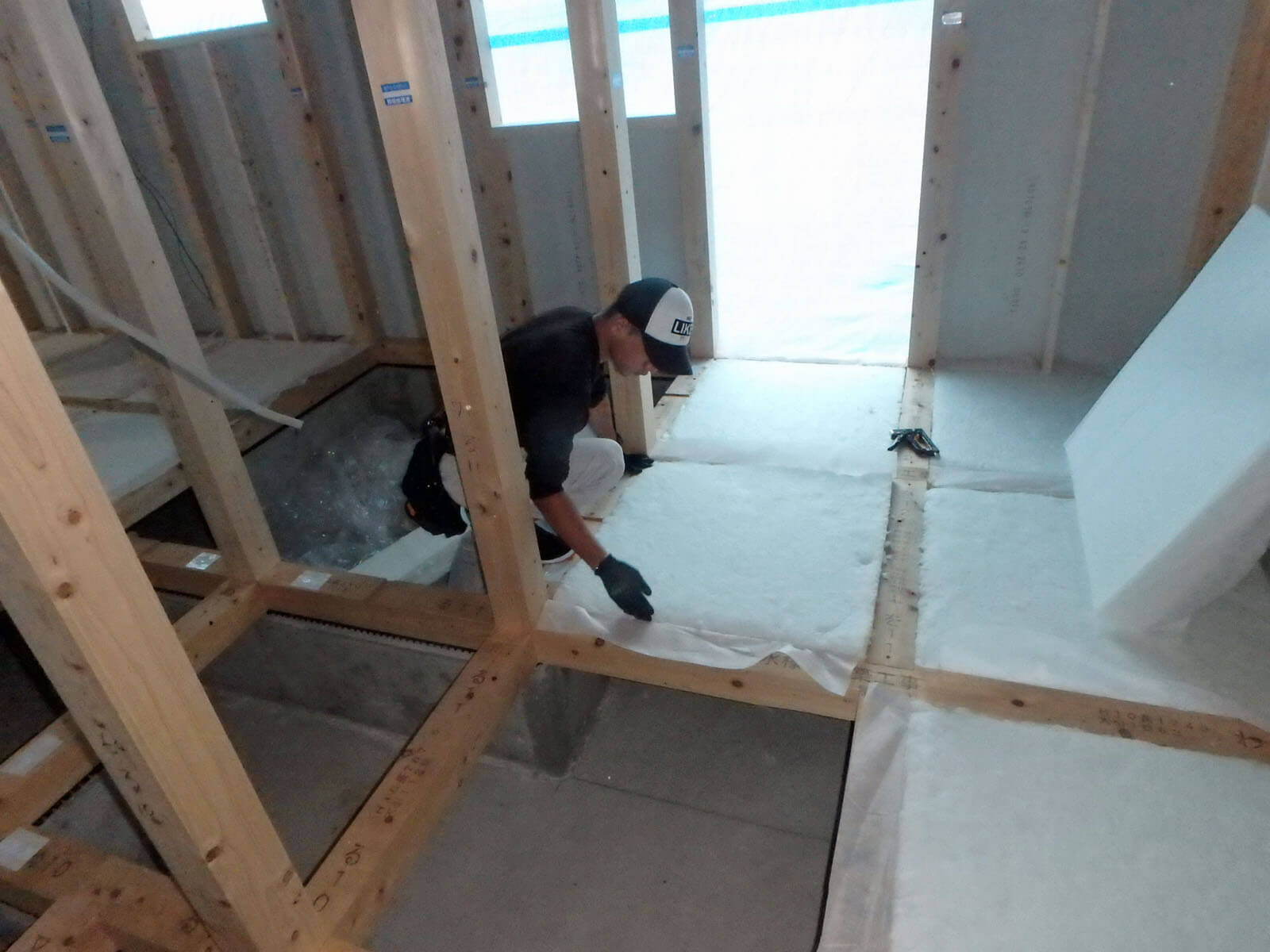 完成すると見えなくなってしまう、基礎、土台、柱、梁などの構造躯体とホールダウン金物などの耐震金物や、こだわりの裸品のグラスウール断熱材と気密シートを実際に見ていただきました。