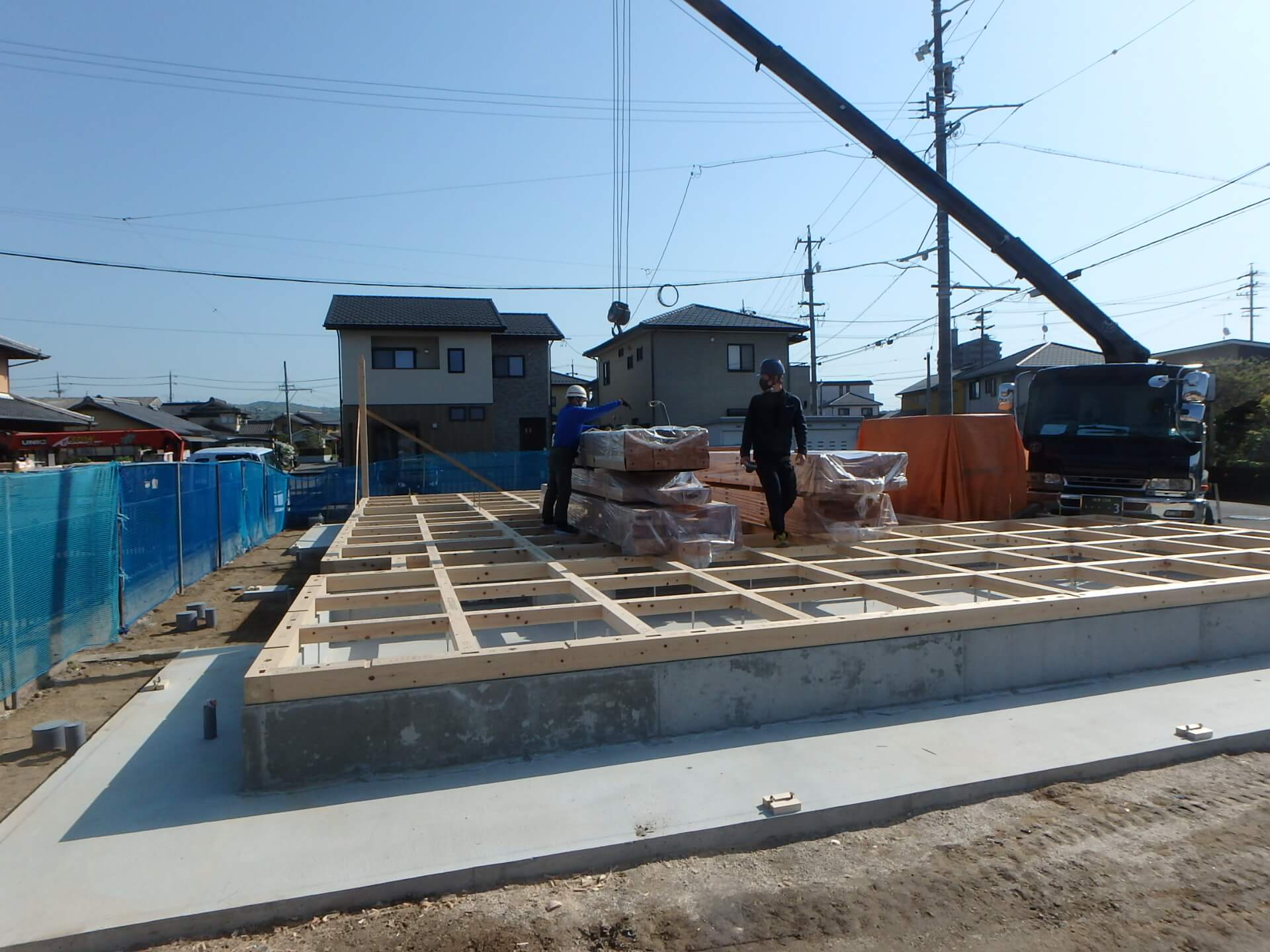 月曜日と火曜日は土台取付です。火曜日は大安吉日ですので、柱を1本建てました。