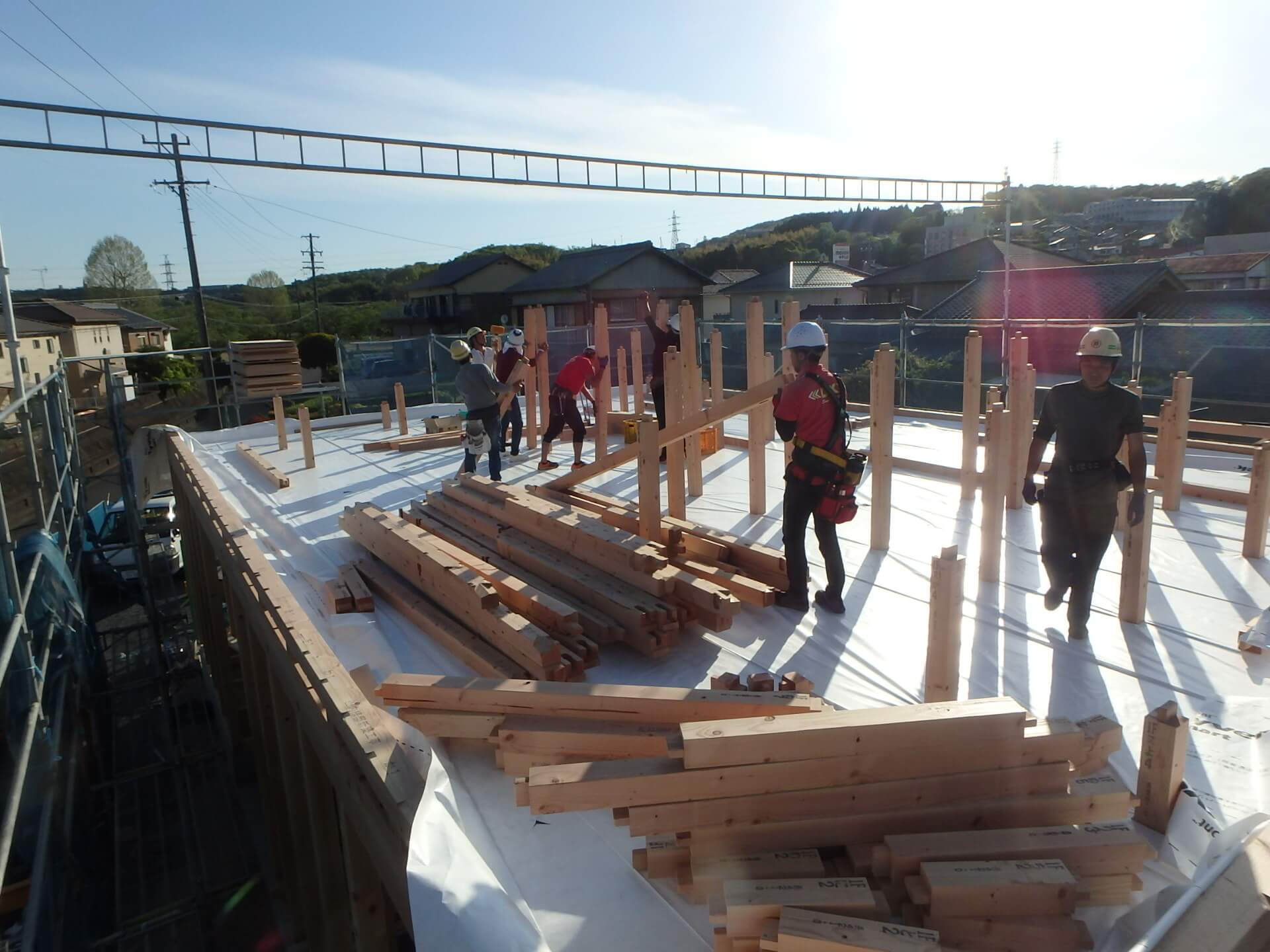 桁上断熱とは桁上に合板を張り、その上に断熱材を敷き詰める桁上断熱工法です。