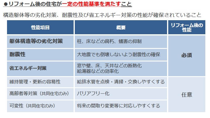 二つ目は、リフォーム後の住宅が一定の性能基準を満たすことです。