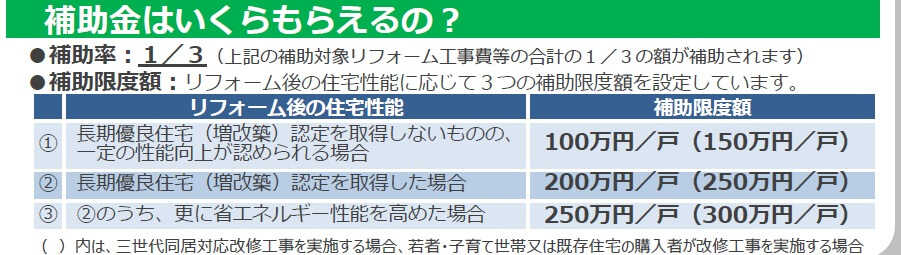 補助金を簡単に説明すると、定められた評価基準のリフォーム工事を行うと最大で100万円/戸、認定長期優良住宅へのリフォームを行った場合、最大で200万円/戸、高度省エネルギー型へのリフォームを行った場合、最大で250万円/戸、を上限に補助してもらえると言う制度です。