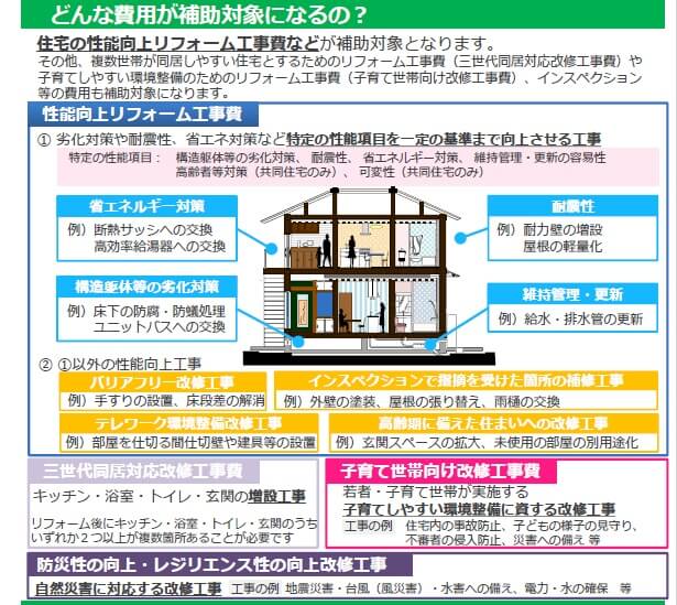 既存住宅の長寿命化や省エネ化など、性能が向上するリフォームや子育て世代向け改修工事に対する支援などを行う事業です。