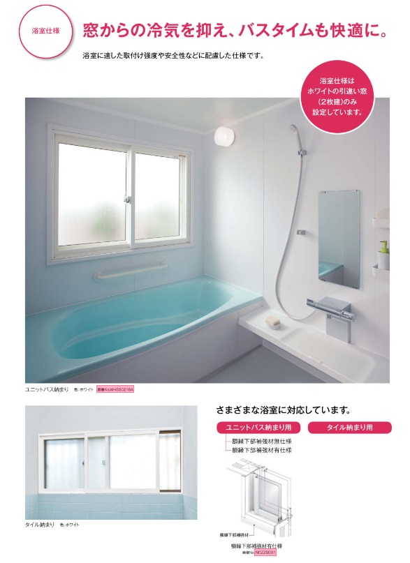 浴室向けの内窓があり、ユニットバスにもタイルの浴室にも対応できます。