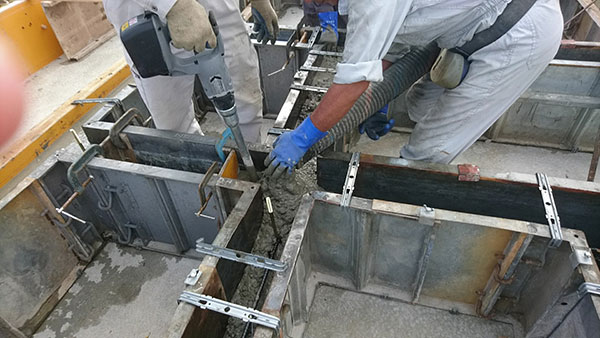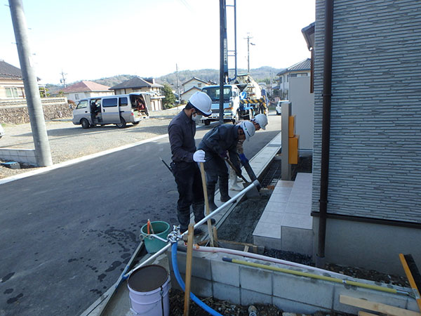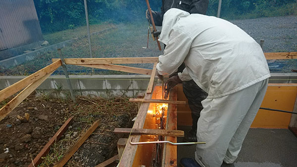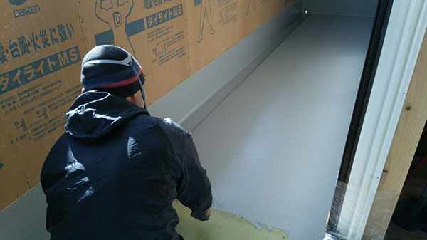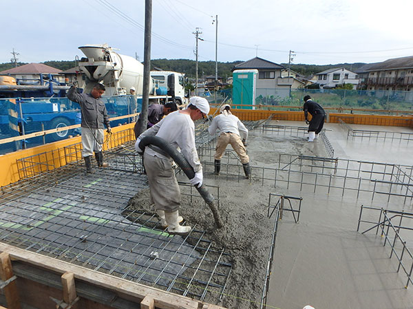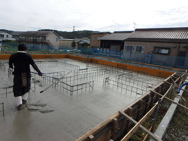 耐圧版コンクリート打設ー左官屋さんが表面を整えます。