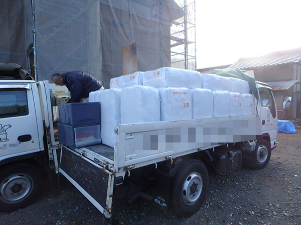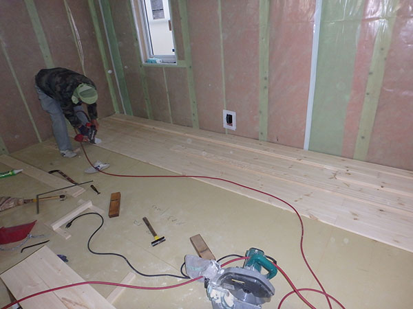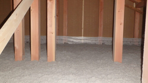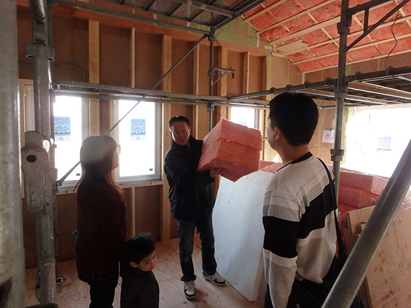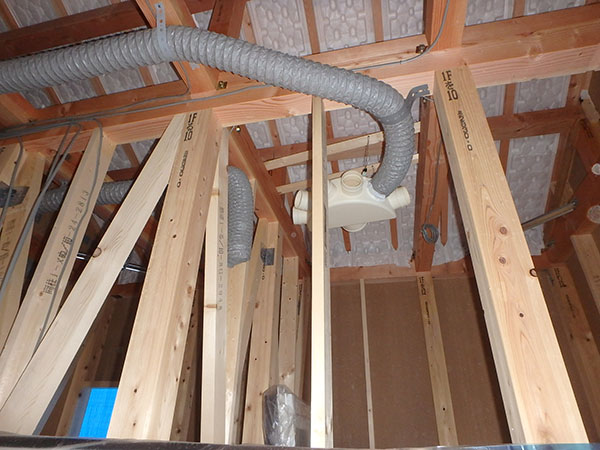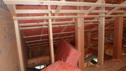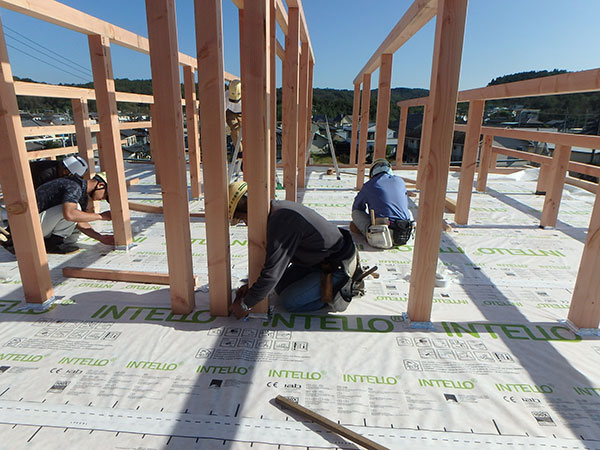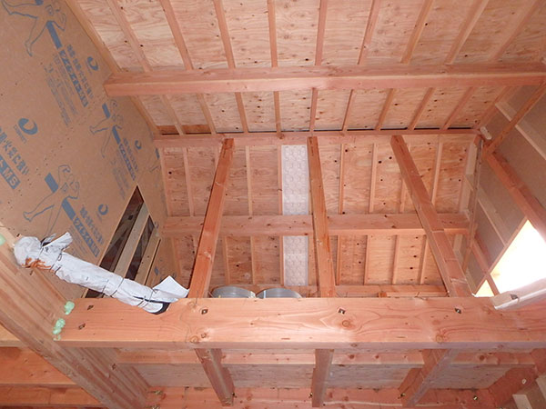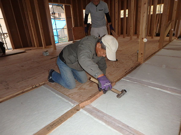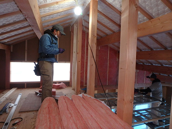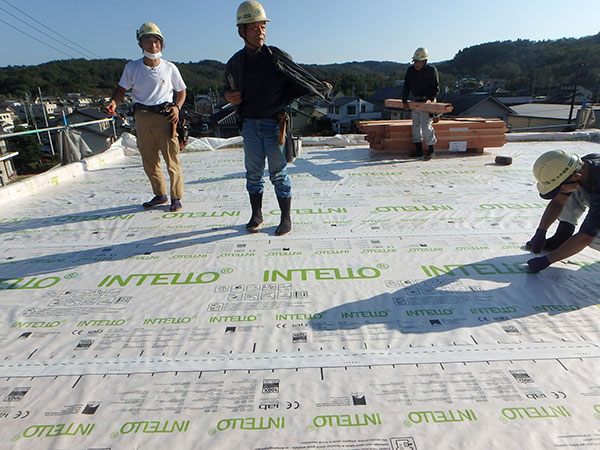 小屋裏断熱の為ここにインテロを敷きます。インテロは湿気やカビの発生を防ぎ断熱材を守るシートです。