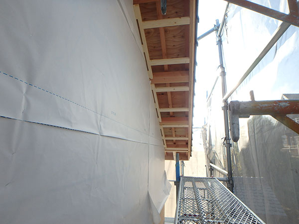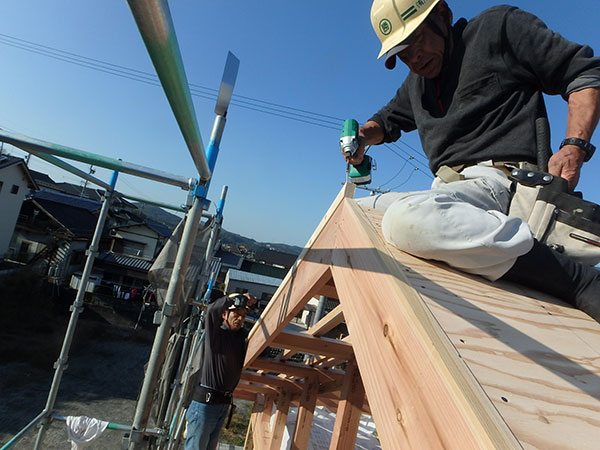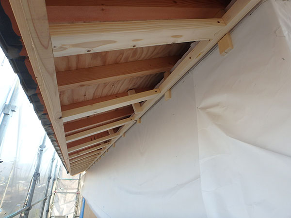 野地板(瓦を乗せるためのいた)を取り付けます。破風(雨の侵入を防ぐ役割)の取付です
