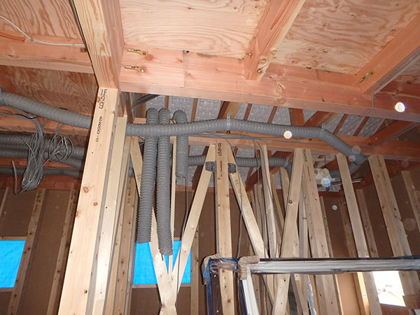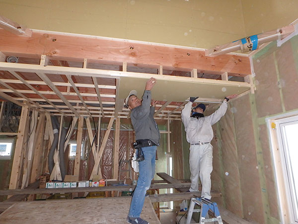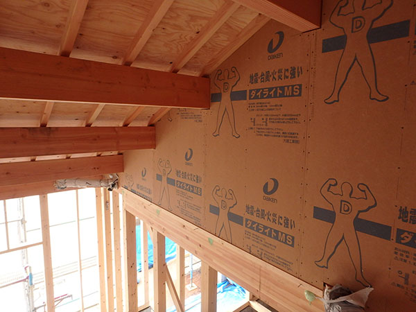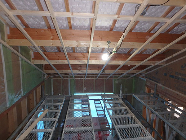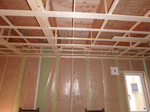 勾配天井(斜め天井)の下地です。ダンタイト(気密を取るシート)も先行して張ります。