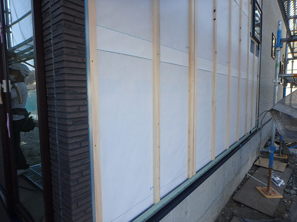 通気胴縁(外壁の取付の下地と外壁内の通気を確保する木材)を取り付けます