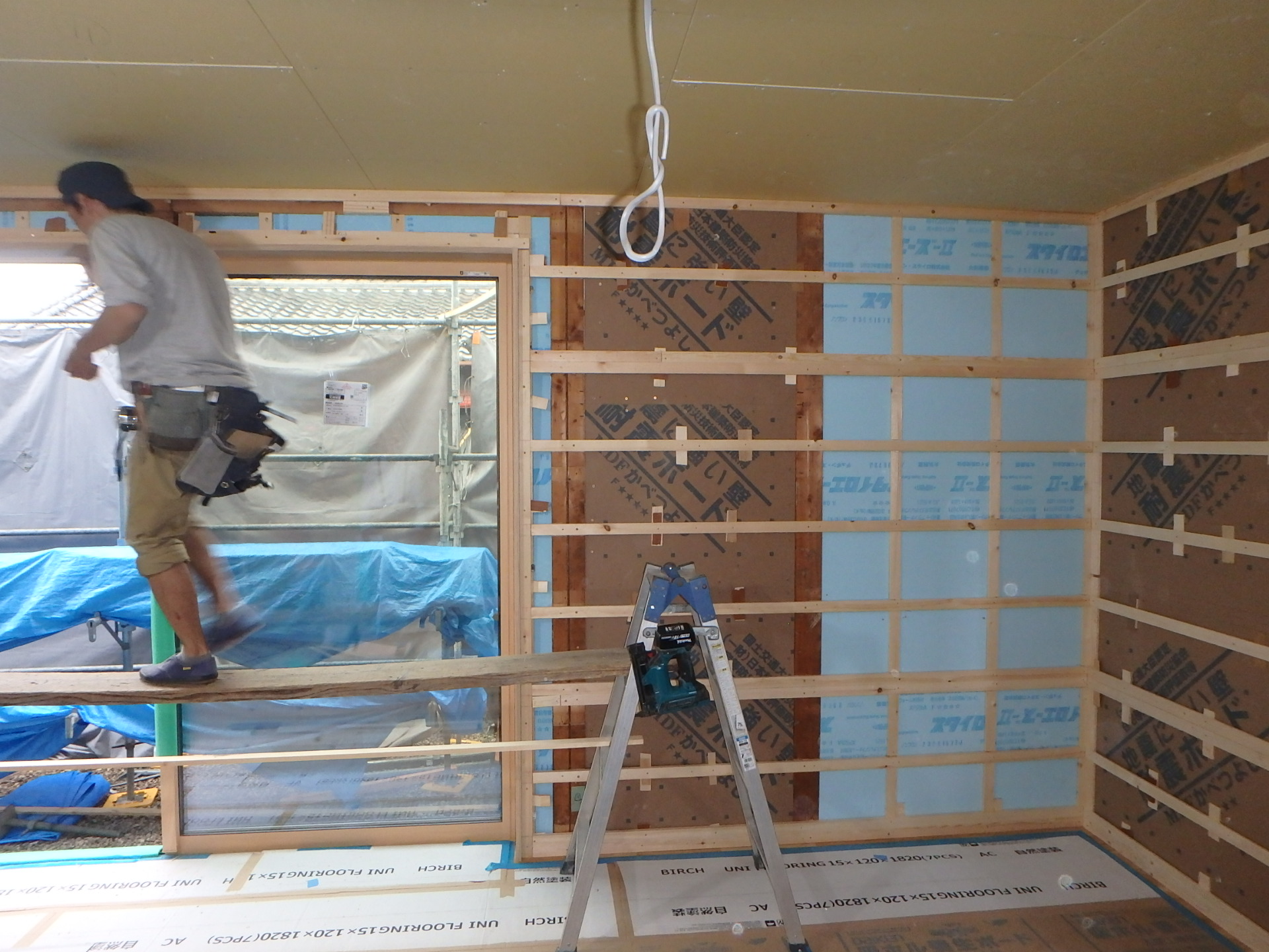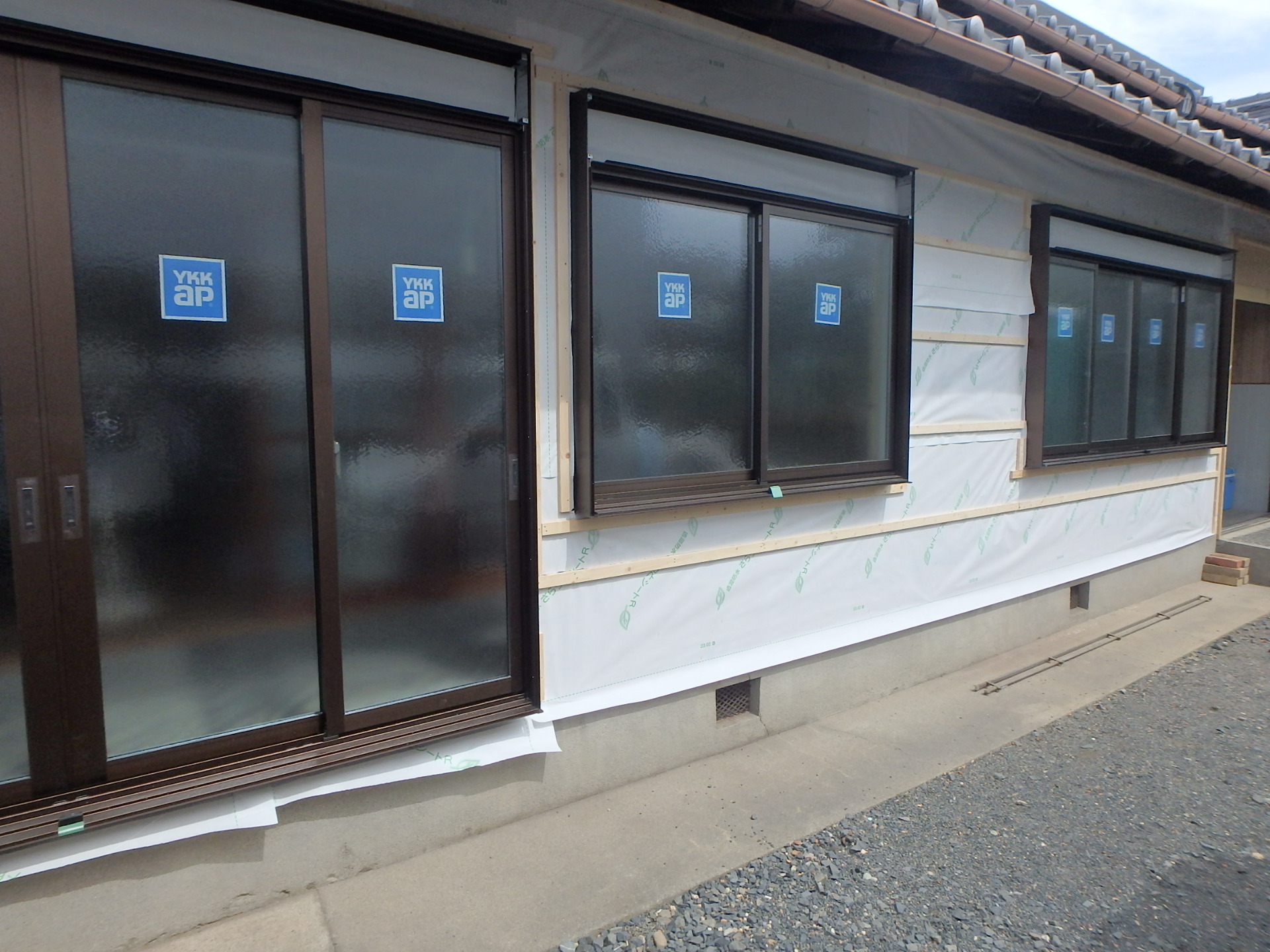 サッシ取付後に耐震パネル(ダイライト)を取付て、防水シートを取付けます