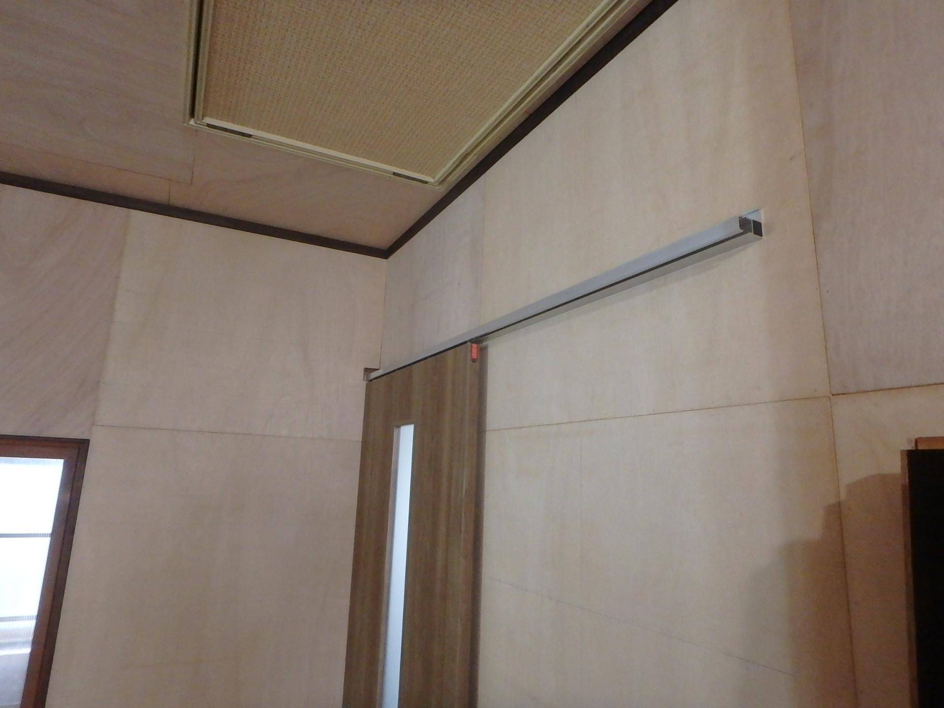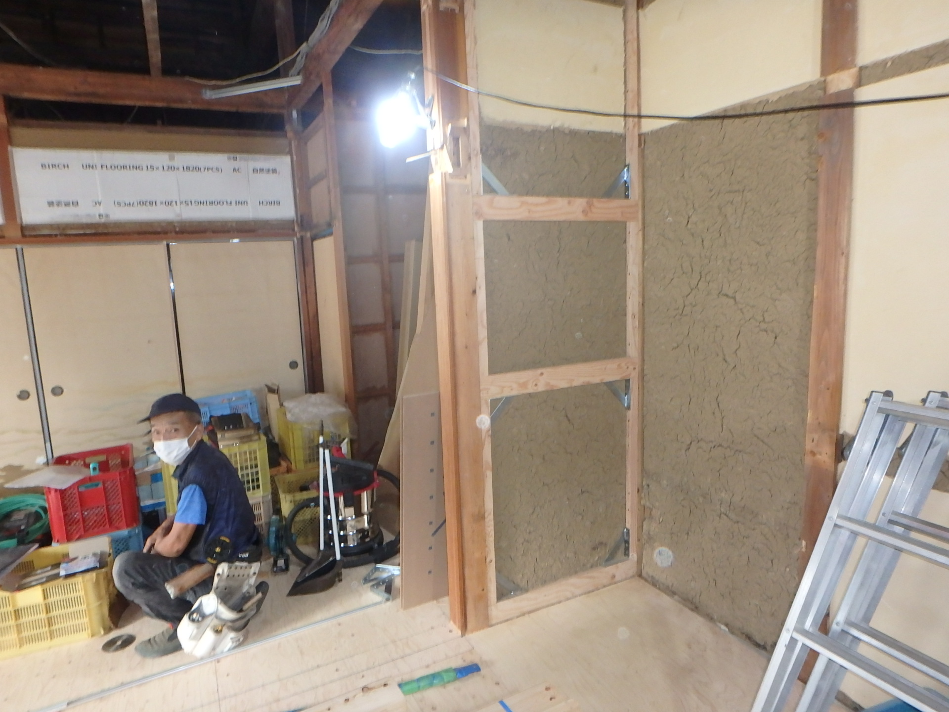 既存柱に下地材を入れて、プラスターボードを張っていきます