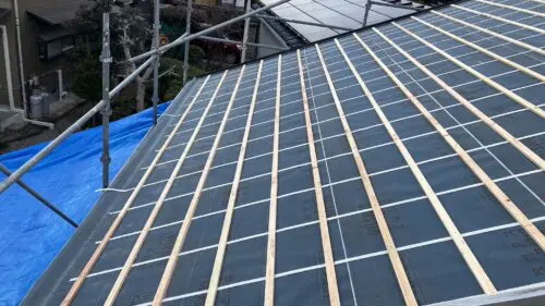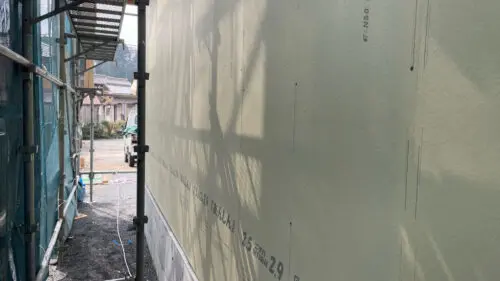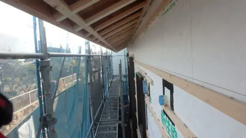 外壁仕上げのガルバリウム鋼板を張る前の下地の状況です。