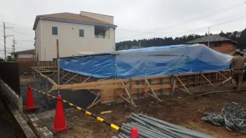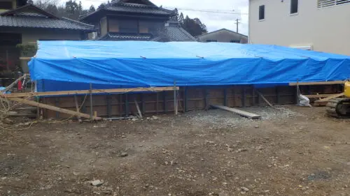 写真が暗くなっているのは、基礎の上部に雨に濡れないようにシートを張っているので。