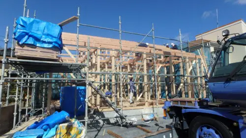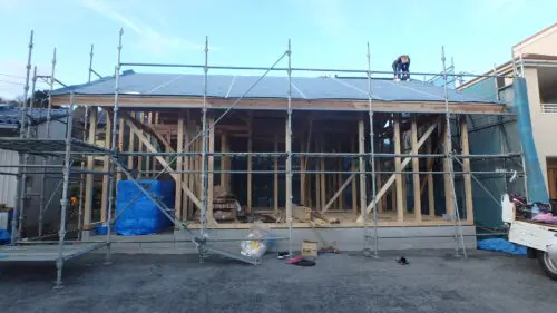 上棟日は、お陰様で天気に恵まれて、雨仕舞(ルーフィング敷き込み)まで出来ました。