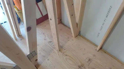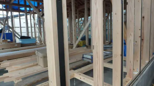 建物外周部に構造用面材取付を取付けます。